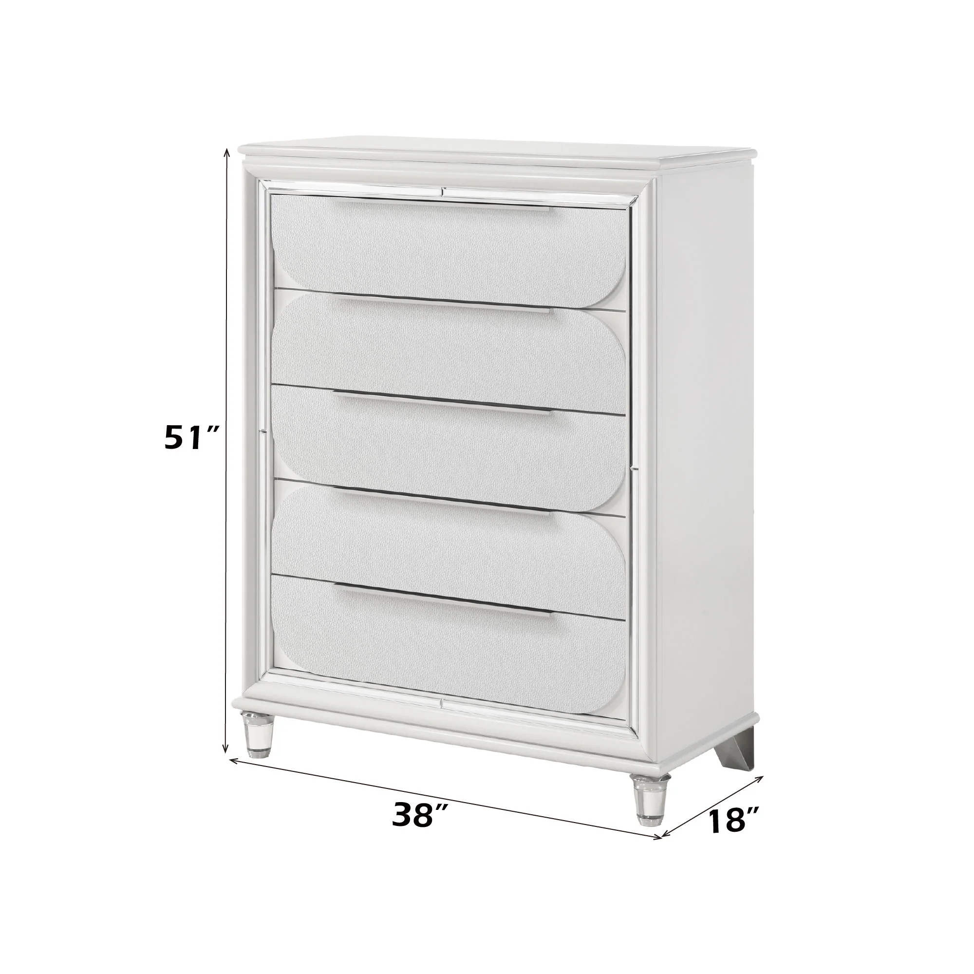 - Modern & Elegant Design: The Tarian Pearl White Finish Chest features a sleek, contemporary look with acrylic crystal legs and embossed drawer fronts, adding a touch of sophistication to any room.